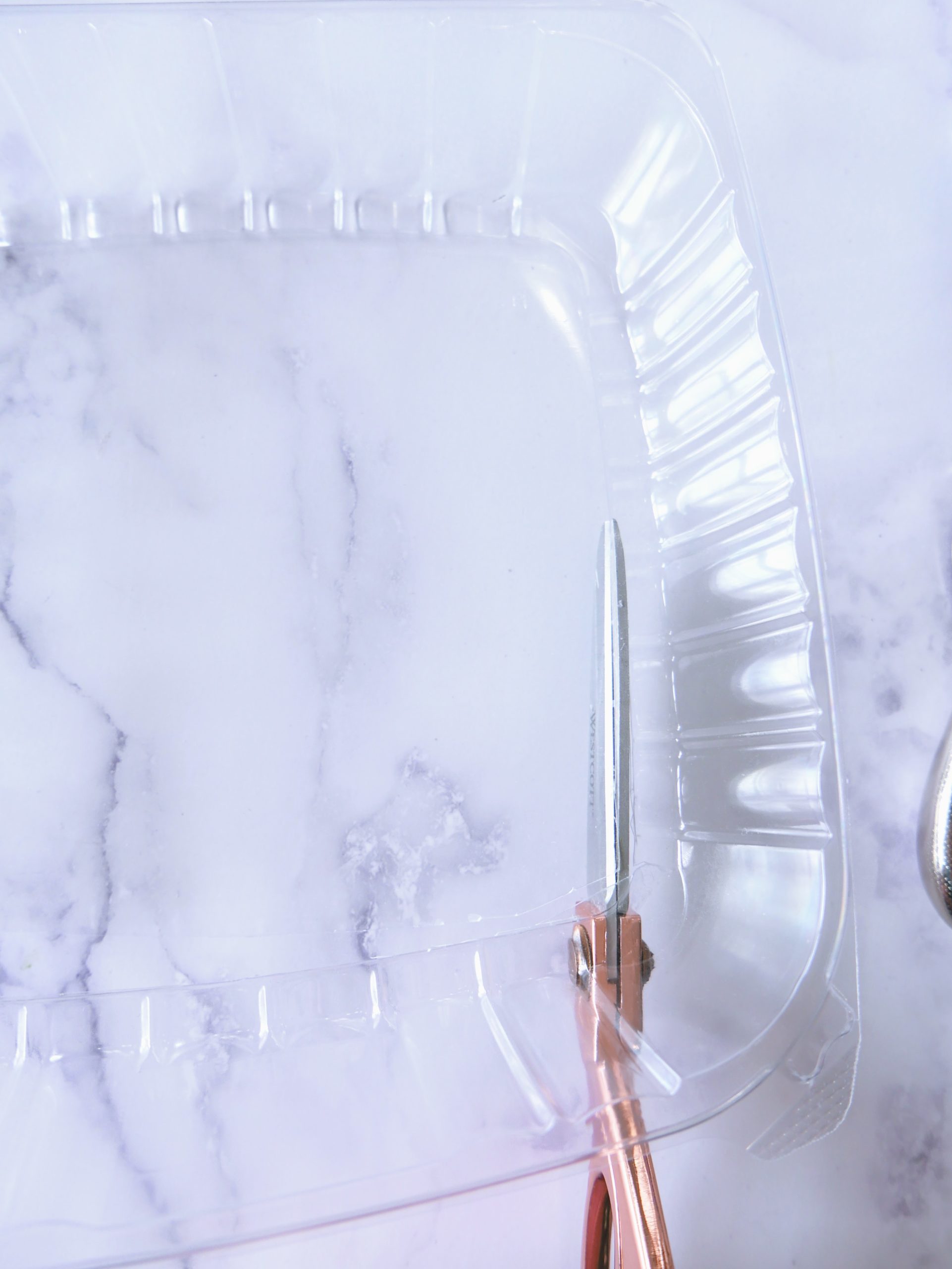 Begin by cutting your take out container into two separate flat sheets, but be careful not to tear it, as it is thin and tears easily.