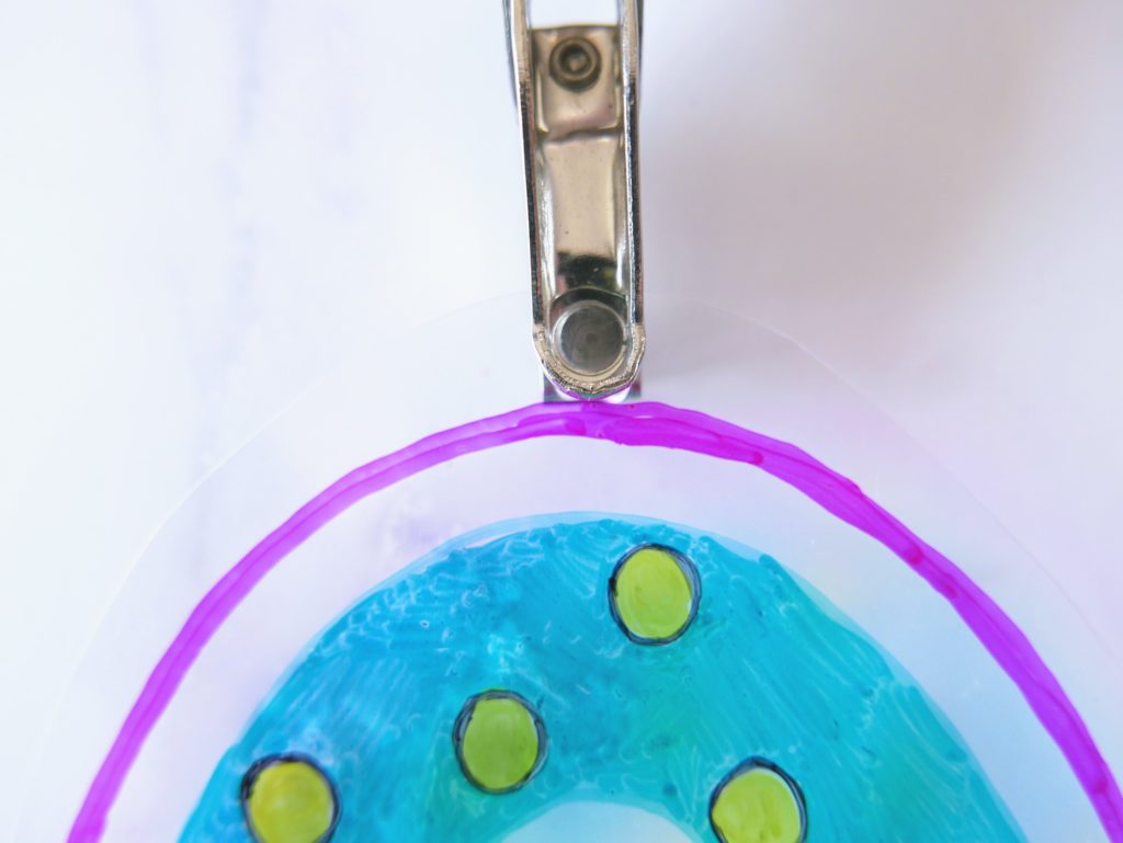 Using the hole puncher, make a hole at the top center of each rainbow in the excess clear plastic portion. This is why it’s important to leave the extra ¼”.