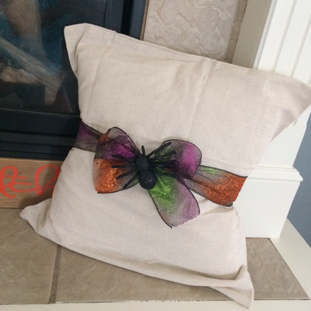 Get some fancy holiday themed ribbon. And guess what? All you do it take a couple strands and make some fancy bows? And let me tell you – they’re not hard to do! These really are just regular bows like when you tie your shoes. On the first pic, I just used two strands of ribbon. And on the Halloween one, I just hot-glued a black glitter spider. DONE!! How simple and cheap is that!!