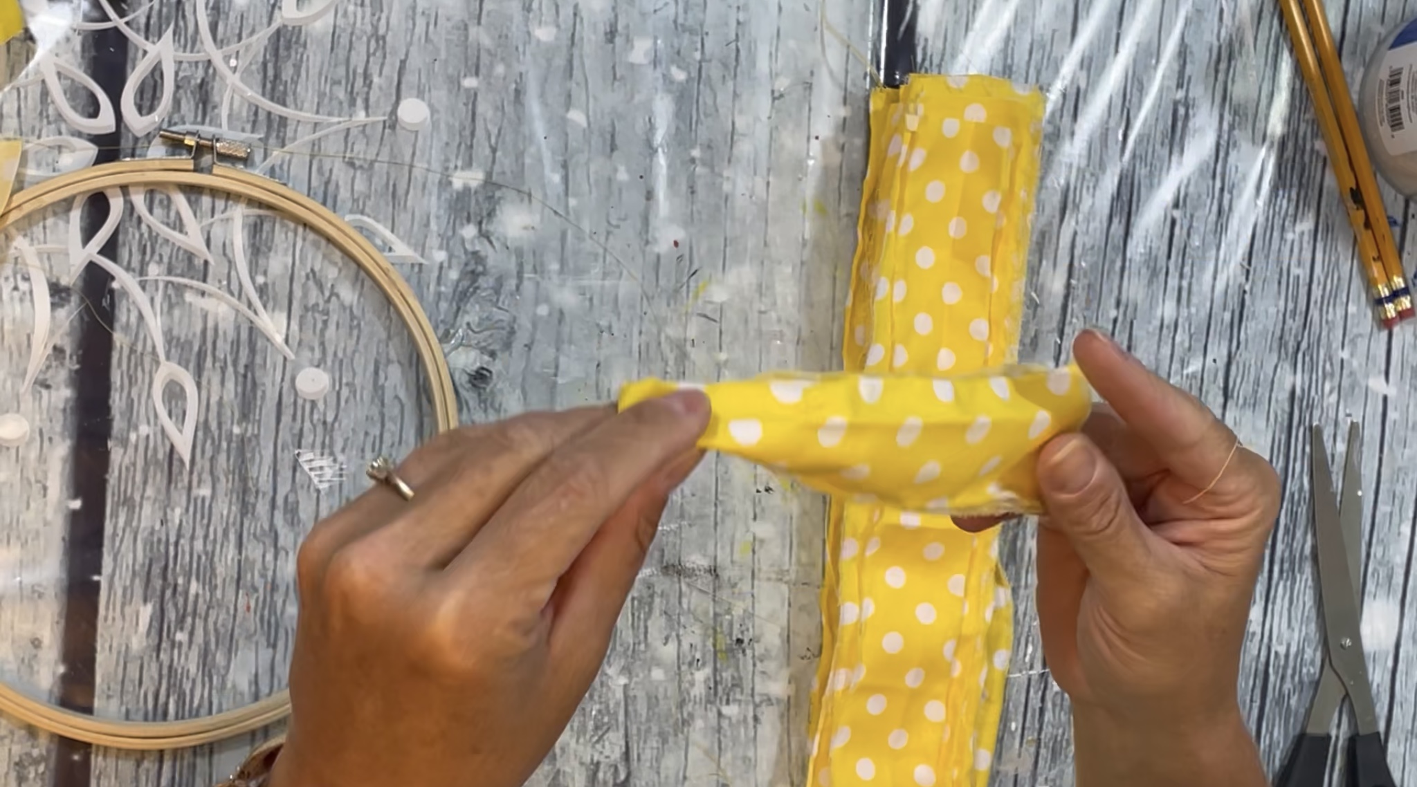 Taking your folded strip of fabric, you’re going to tie it around the embroidery hoop, looping your tails through the folded loop. Do this all the way around the embroidery hoop until it’s full.