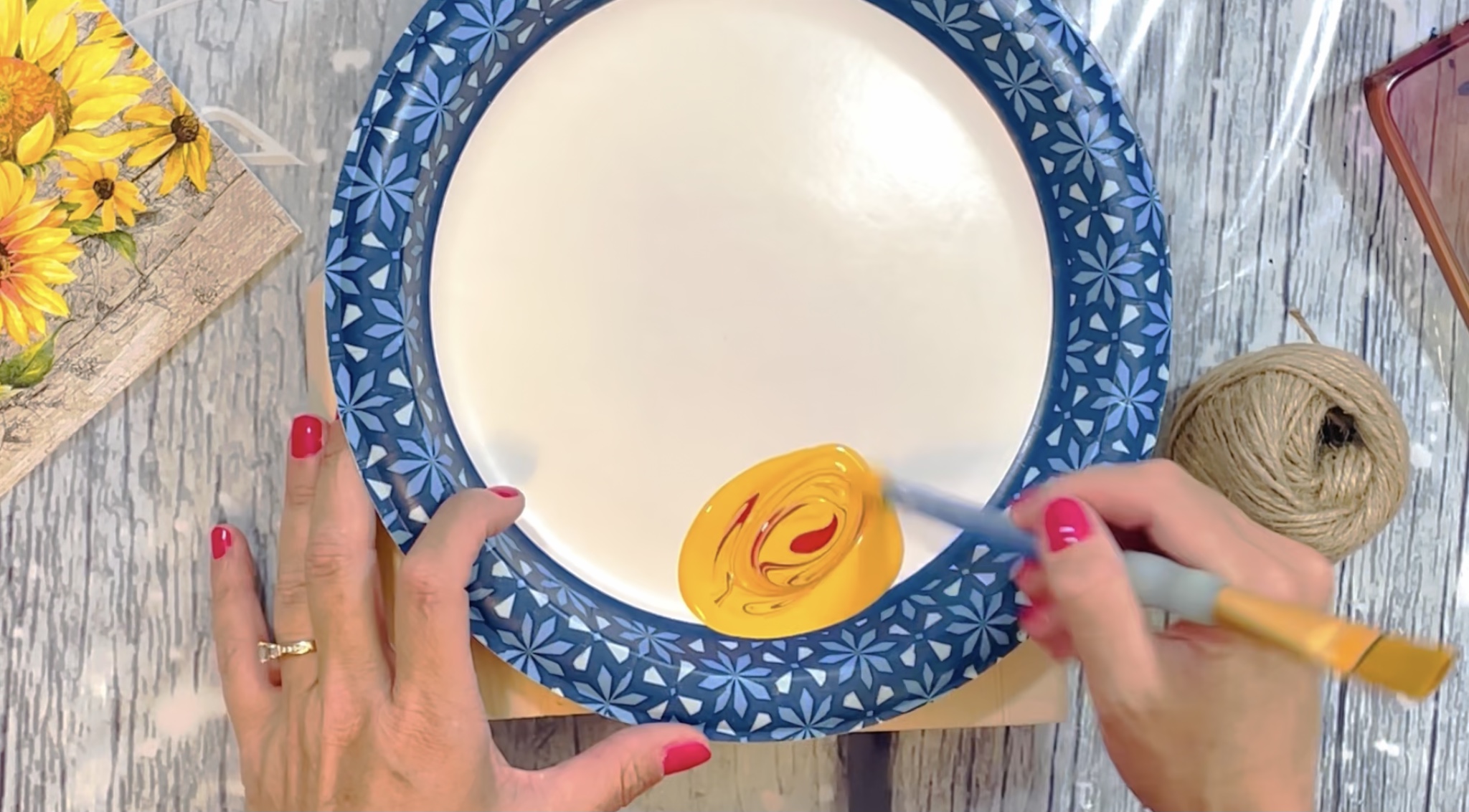 To start, I wanted to paint the edges of my wooden houses to match the napkins, but I wanted to highlight to reddish peach color in the centers. I mixed a couple colors of paint to achieve the color I wanted.
